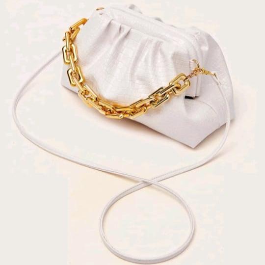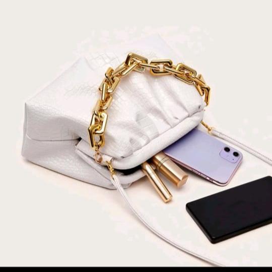 Elegante, moderno y limpio diseño fruncido en material tipo cocodrilo con una asa de mano hermosisima en color dorado. Tambien incluye su cordon para cruzar.