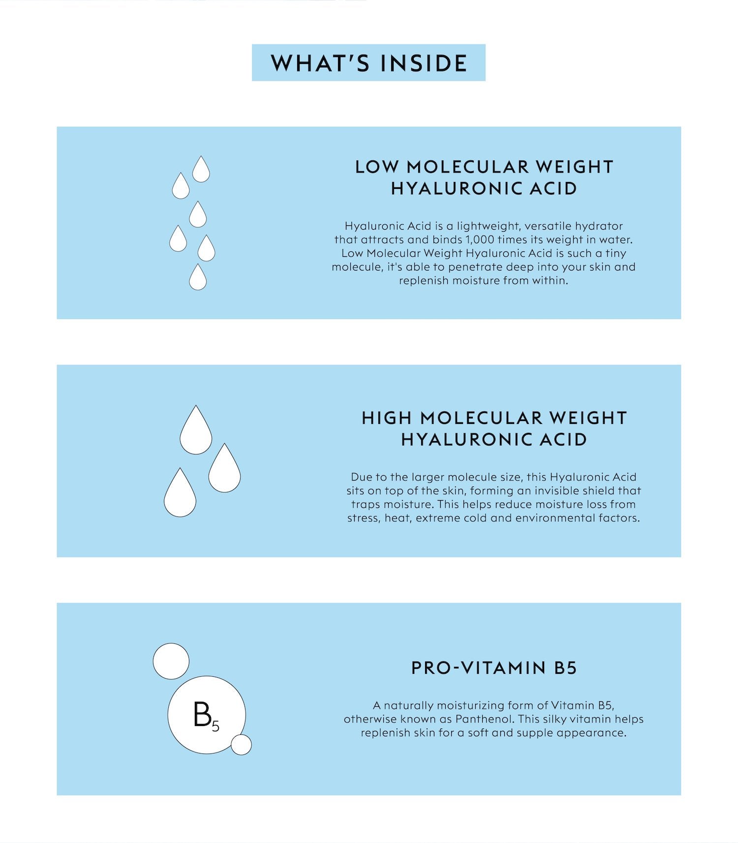 Un sérum que ayuda a reponer la hidratación de la piel mediante un complejo único de ácido hialurónico de bajo y alto peso molecular. Los pesos moleculares escalonados del ácido hialurónico están diseñados para promover una hidratación profunda tanto en la superficie de la piel como en la epidermis. Enriquecido con provitamina B5, la elasticidad de la piel mejora y se siente y luce más suave que antes.