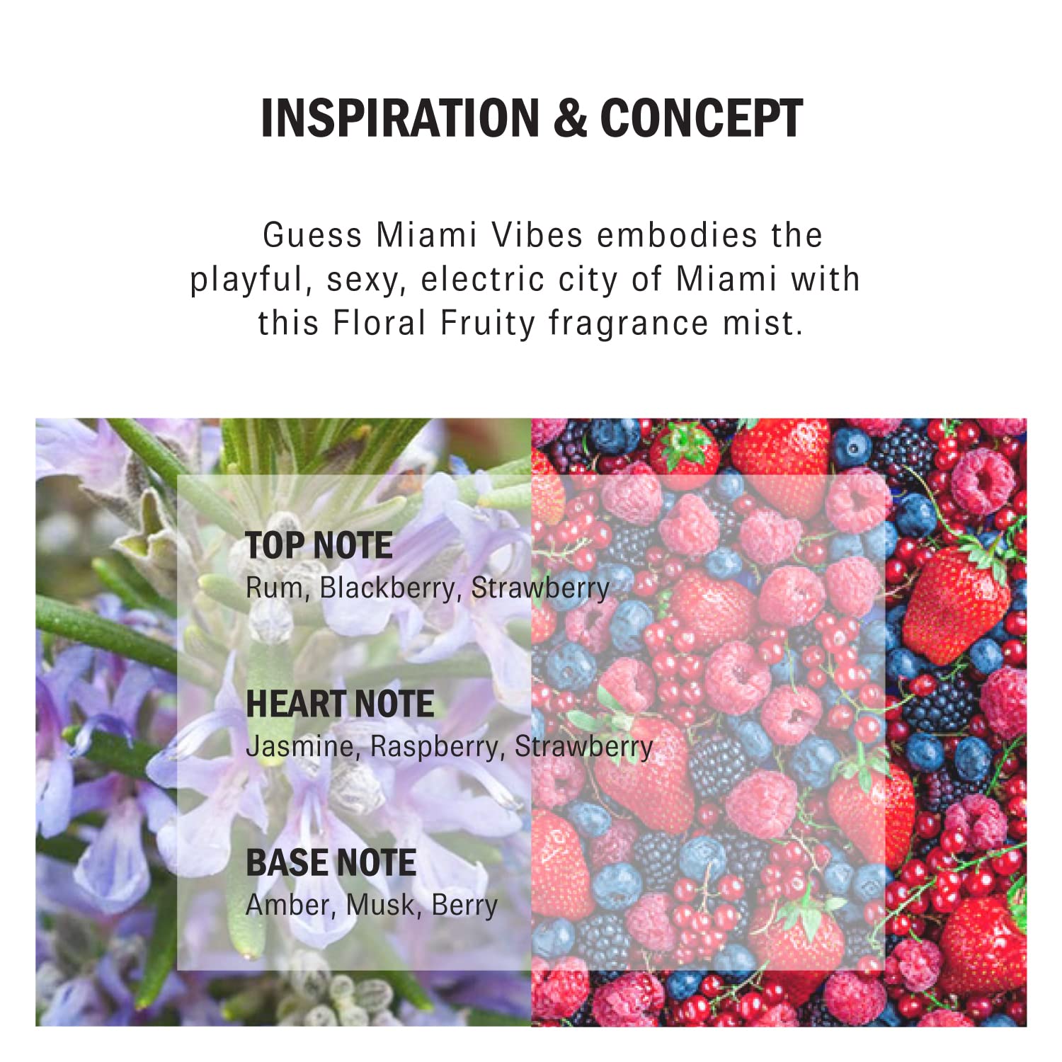 Guess Miami Vibes es una bruma combinada con un brillo seductor para un aroma juguetón y sexy que encarna la ciudad eléctrica de Miami. Es para la mujer que manda en la sala y es tan animado y emocionante como la magnética ciudad de Miami.